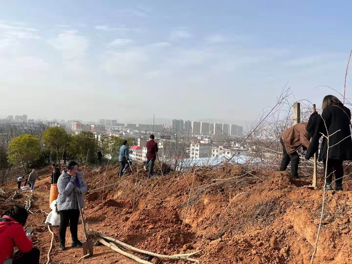 三月的天气虽然还透着丝丝寒意,但丝毫没有影响大家的热情。植树活动开始,大家自发几人一组,按照栽树育苗的要求,挥锄挖土培土、扶苗、浇水灌溉,各个环节衔接有序,样样做得认真到位,干得不亦乐乎。经过大家的辛勤劳动,新栽种的树苗一排排、一列列,整齐有序地挺立在春风中。